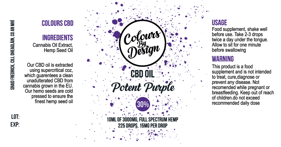 Potent Purple the strongest of the Colours CBD range this blend is for those that are in great need of improving their well-being and require immediate relief. Similar to our other oils Potent Purple can be taken at any time of the day and is also recommended before bedtime or immediately if any pain or discomfort arises in the system.